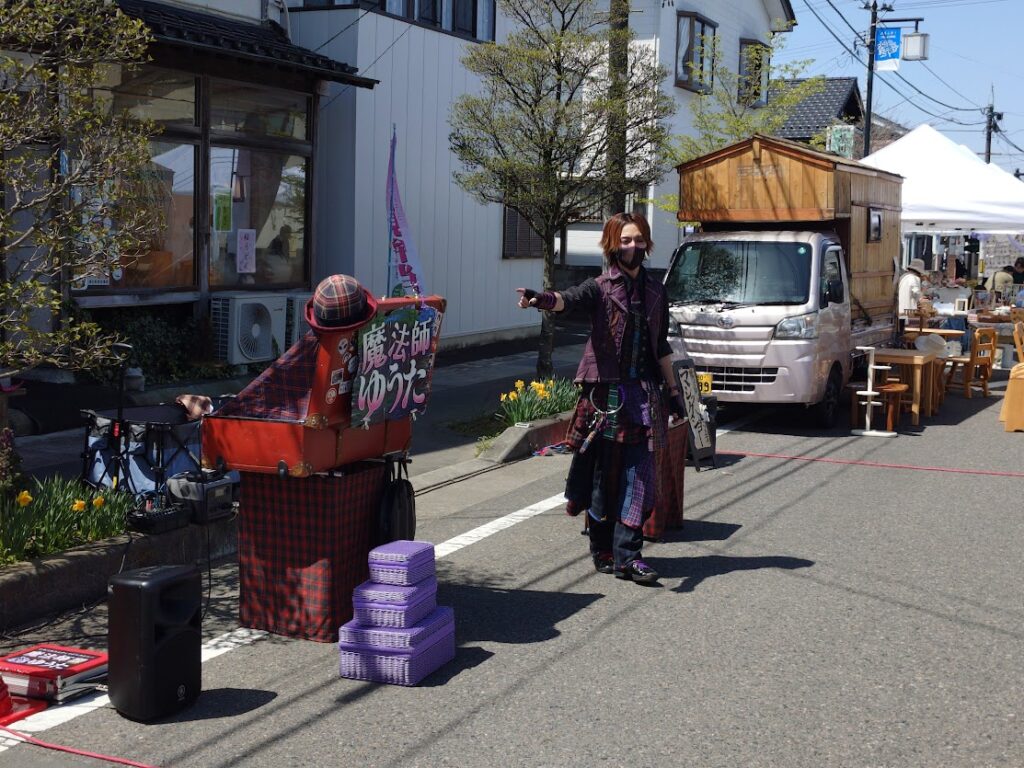 オープニングに恒例の地雷火太鼓の面々の太鼓演奏。会場中央付近では、大道芸の「魔法師ゆうた」さんのマジック。