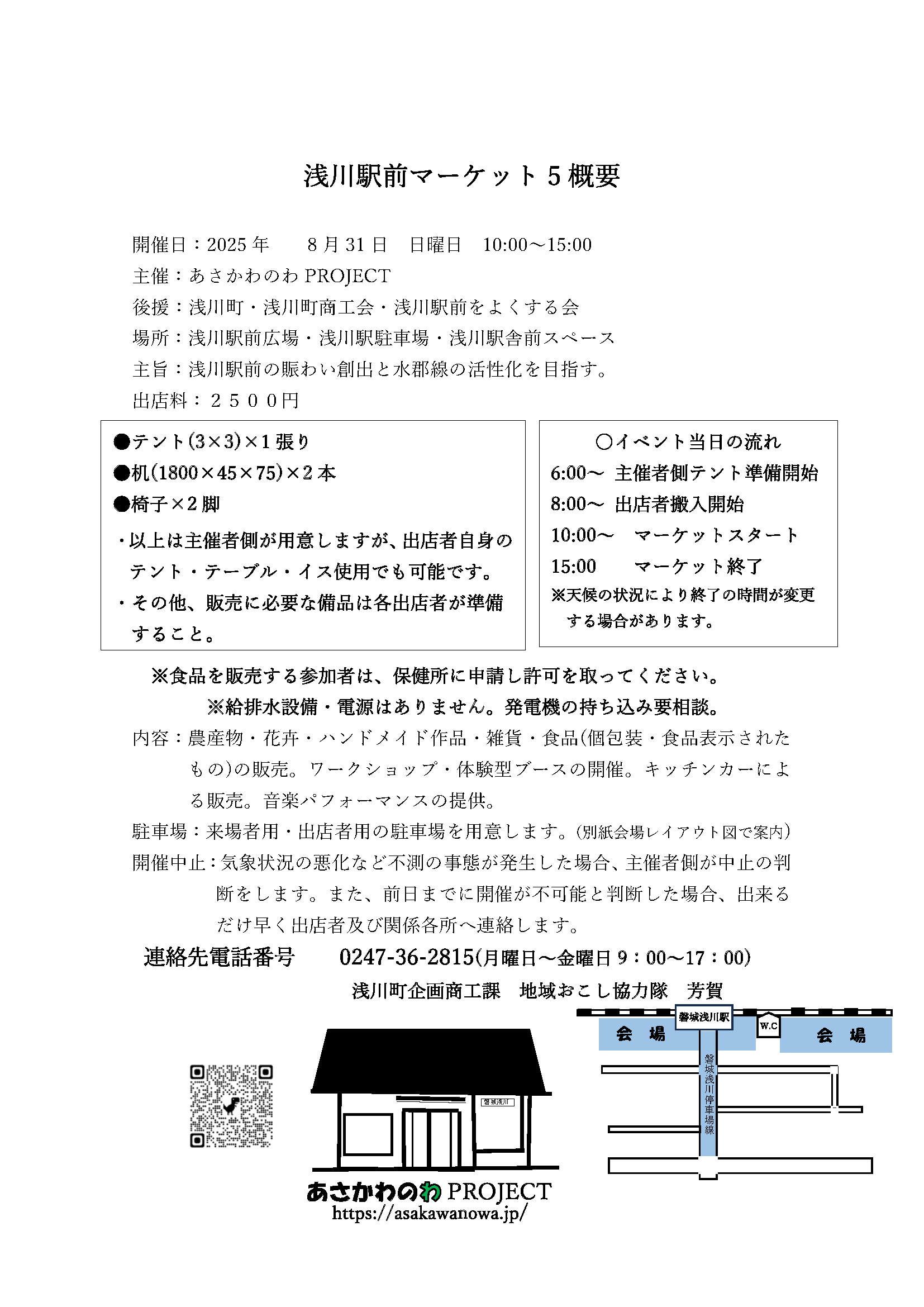 | 第5回 『浅川駅前マーケット』が開催されます。 浅川町企画商工課 地域おこし協力隊 芳賀 主催:あさかわのわ PROJECT 連絡先電話番号 : 0247-36-2815(月曜日~金曜日 9:00~17:00) | 日時 2025年8月31日(日) 時間 午前10時00分~15時00分 場所 : 浅川駅広場 |