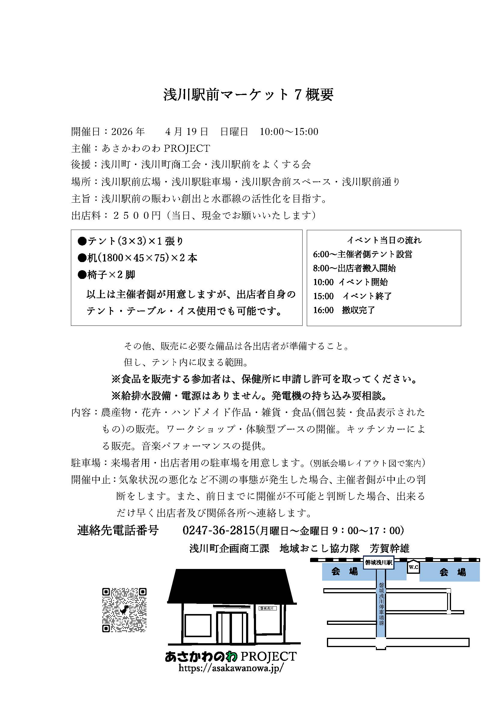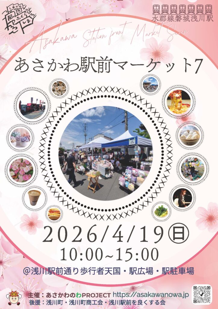 | 第7回 『浅川駅前マーケット』が開催されます。 浅川町企画商工課 地域おこし協力隊 芳賀 主催:あさかわのわ PROJECT 連絡先電話番号 : 0247-36-2815(月曜日~金曜日 9:00~17:00) | 日時 2026年4月19日(日) 時間 午前10時00分~15時00分 場所 : 浅川駅前通り歩行者天国 ・駅広場・駅駐車場 |